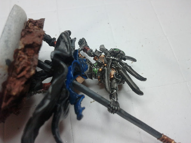 Once it is all dry you can use what ever colors you had in mind, and use the dry brushing technique to give the rocks some depth and dimension. Use your brightest color only on the edges of the cork to give it a lighting effect and you will be done. Add some sort of static grass or "Underbrush" from woodland scenics for the foliage and you can also line the base of the cork with green or brown"Fine Turf" to create moss or erosion.If you have heads, arms, legs, torsos, hands, etc laying around a bits bow, you could also add these to the base and paint them all gored up. You could even use the sprue you cut your minis off of to make crystals, logs, steel beams, etc. I reuse and recycle anything that i think will look good in a mini.